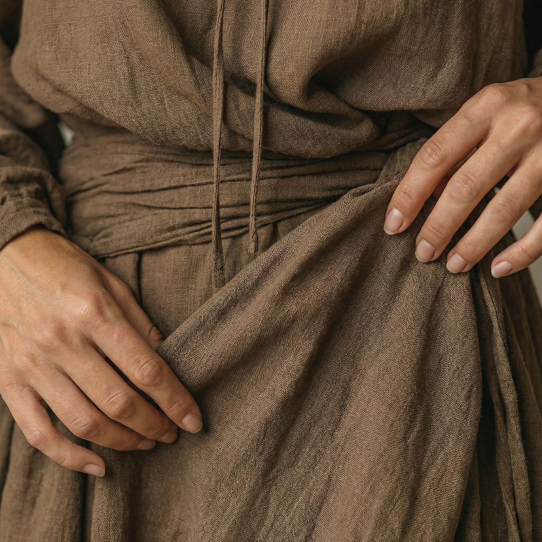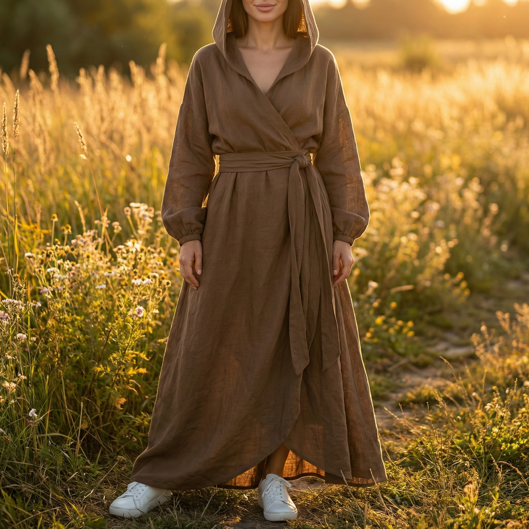 Sorella™ is designed for women who appreciate relaxed structure, quiet sophistication, and seasonal comfort. The flowing maxi silhouette elongates the figure while allowing natural movement, and the sculpted hooded neckline adds modern character. Crafted from a cotton-linen blend, it offers breathable warmth ideal for cooler days and layered moments.